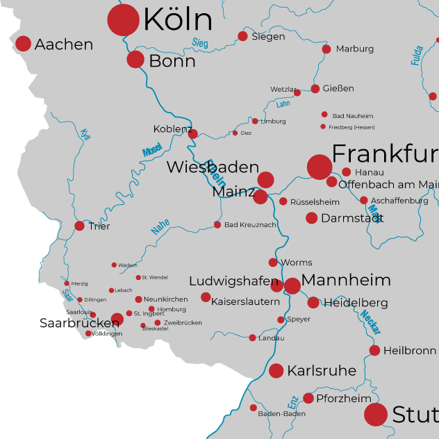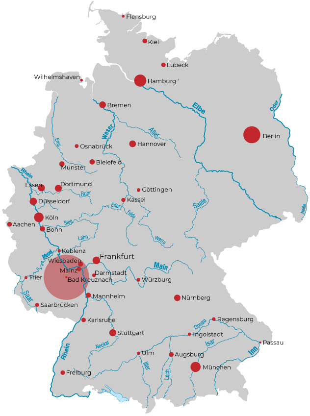 Bad Kreuznach liegt etwa dreißig Kilometer in südwestlicher Richtung von der Landeshautpstadt Mainz entfernt.