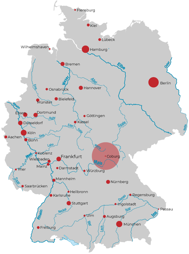 Die kreisfreie Stadt Coburg liegt im Regierungsbezirk Oberfranken in Bayern und gehört zur Metropolregion Nürnberg.