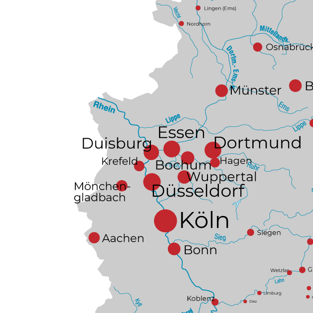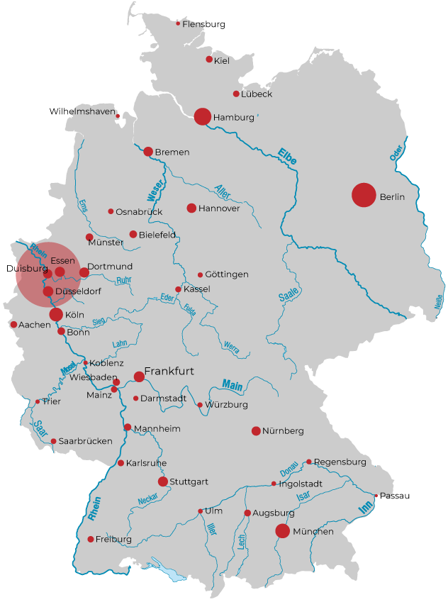 Die kreisfreie Großstadt Duisburg im Regierungsbezirk Düsseldorf liegt an der zentral gelegenen Mündung der Ruhr in den Rhein.