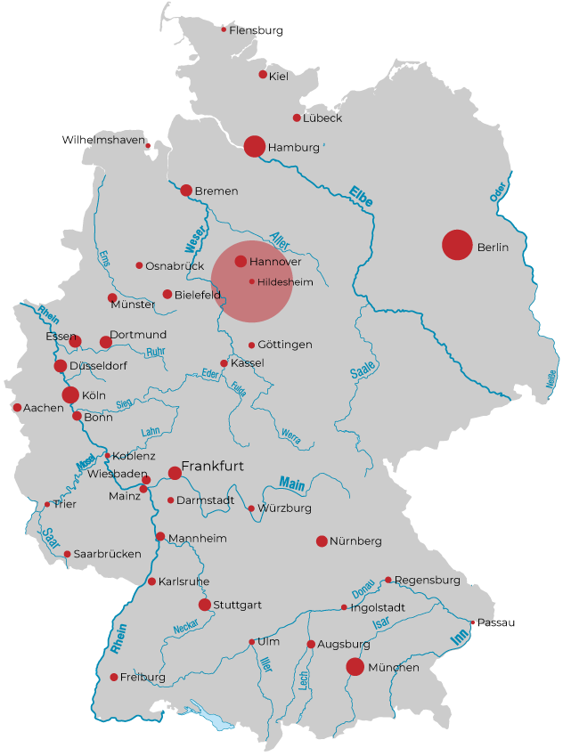 Heute ist Hildesheim mit fast 104.000 Einwohnern in zehn Ortschaften eine Kreisstadt des Landkreises Hildesheim, ein Oberzentrum Niedersachsens und dessen kleinste Großstadt.