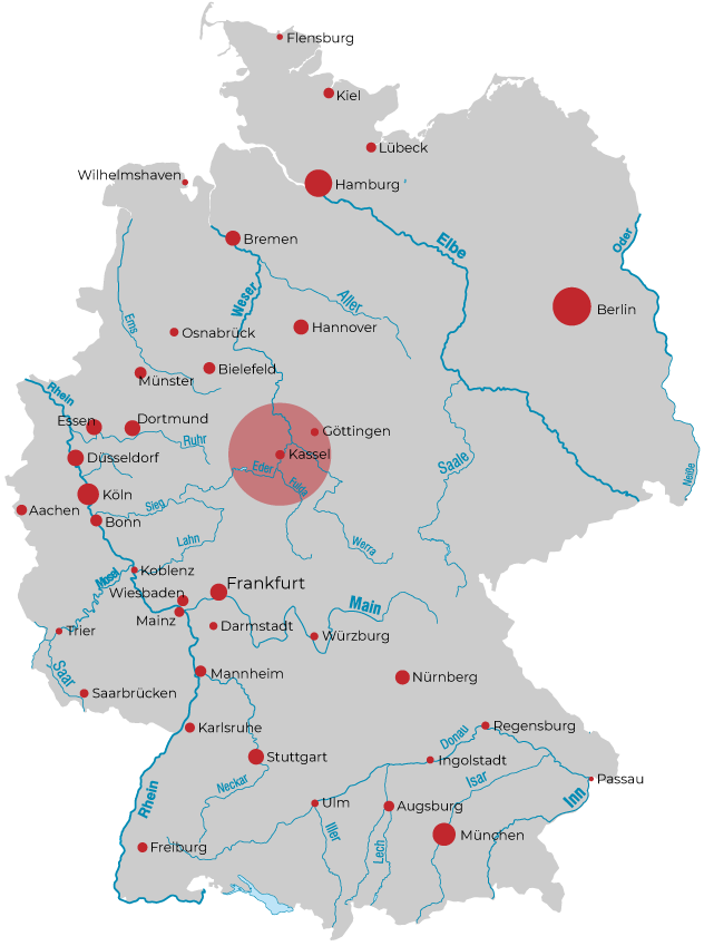 Die kreisfreie Stadt Kassel liegt in Hessens Norden ungefähr zwischen Frankfurt und Hannover. Sie ist ein Oberzentrum des Bundeslandes. Sowohl die Verwaltung des Landkreises Kassel als auch die des Regierungsbezirkes Kassel haben ihren Sitz in Hessens drittgrößter Stadt mit über 204.000 Einwohnern. Die Stadt im weitläufigen Talkessel, dem Kasseler Becken, ist in 23 Ortsbezirke aufgeteilt, innerhalb derer es teilweise noch Siedlungen mit eigenen Namen gibt.