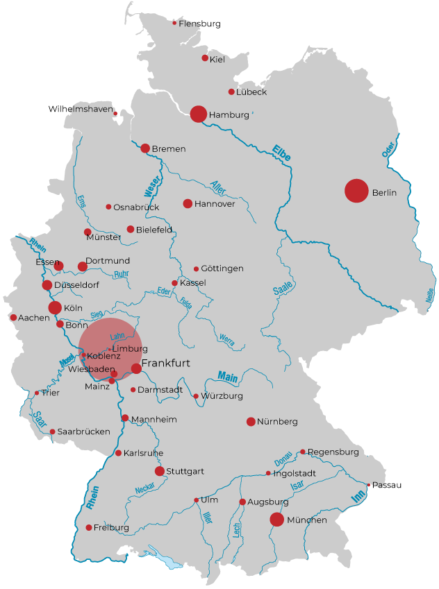 Limburg an der Lahn, die Kreisstadt des Landkreises Limburg-Weilburg und einer der elf Bezirke des Bistums Limburg, liegt beidseits der Lahn an der westlichen Grenze Hessens, zwischen Taunus und Westerwald sowie an den Ferienstraßen Deutsche Fachwerkstraße und Lahn-Ferien-Straße.