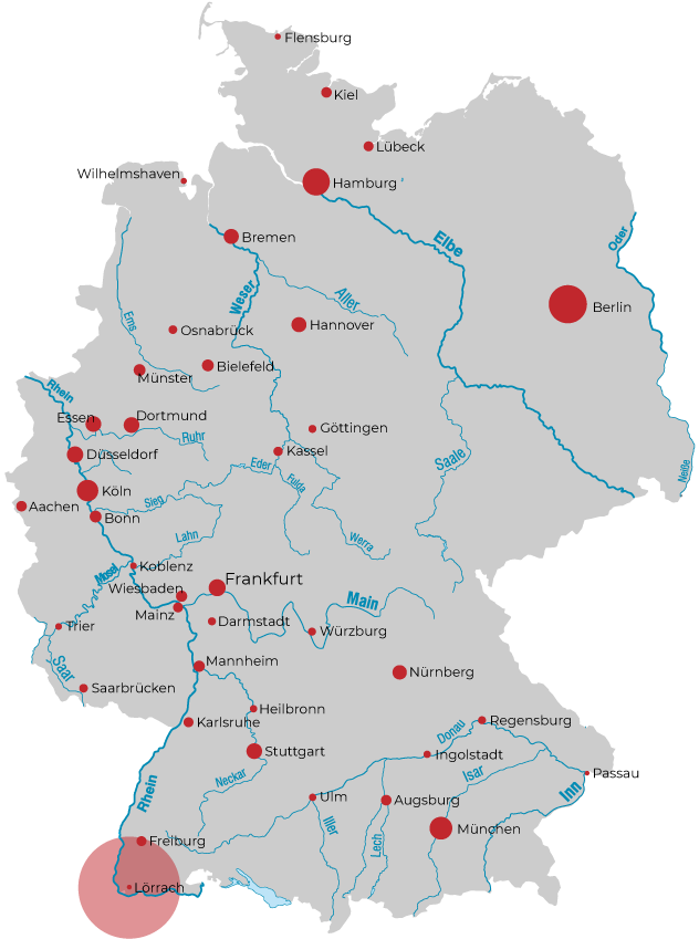 Lörrach ist das Zentrum der zum Dreiländereck gehörenden Länder Deutschland, Schweiz und Frankreich und Teil der Metropolregion Basel.