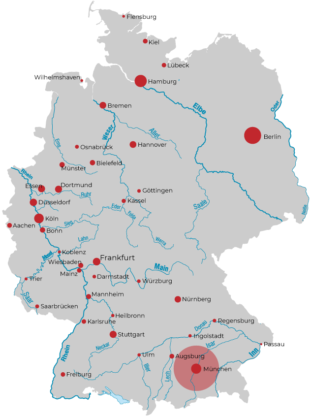 Durch München fließen die Würm, die Isar, deren Seitenkanal, der Isar-Werkkanal, viele von der Isar abzweigende Bäche wie der Auer Mühlbach, der Eisbach und der Hachinger Bach.