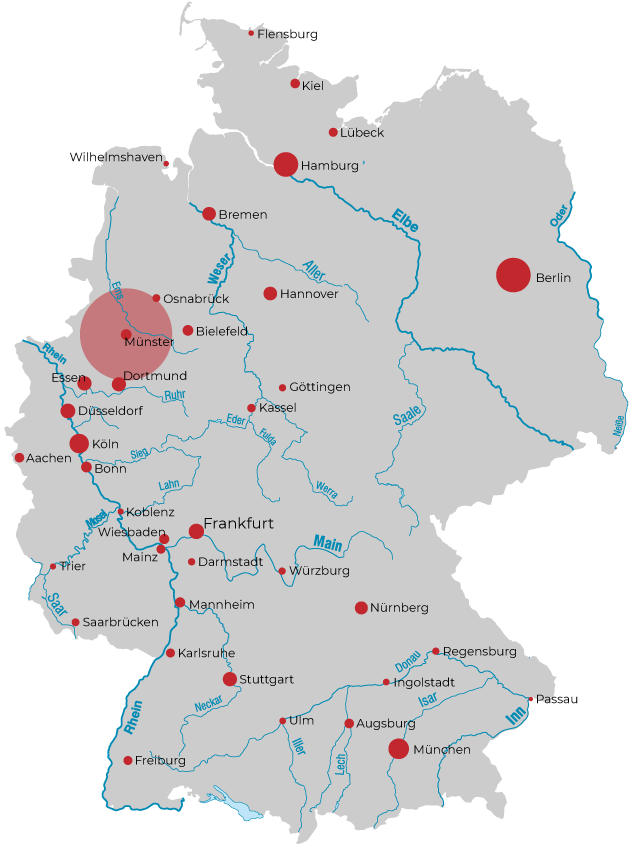 Die kreisfreie Stadt Münster liegt etwa fünfzig Kilometer nordöstlich von Dortmund im Landesteil Westfalen, genauer in der Region Münsterland, in Nordrhein-Westfalen.