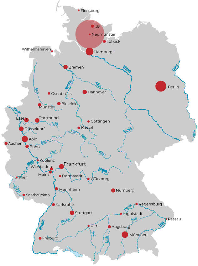 Die kreisfreie Stadt Neumünster liegt mitten in Schleswig-Holstein an der Schwale.