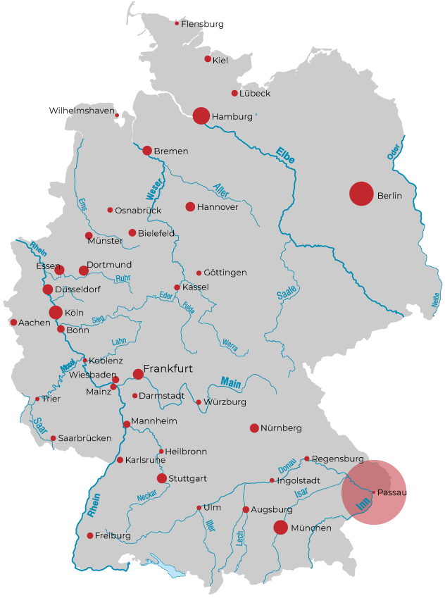 Mit der Donau fließen die von Norden kommende Ilz und der Inn aus dem Süden am Drei-Flüsse-Eck an Passaus Ortsspitze zusammen in Richtung Osten, was aufgrund ihrer unterschiedlichen Wasserfarben wunderschön anzusehen ist.