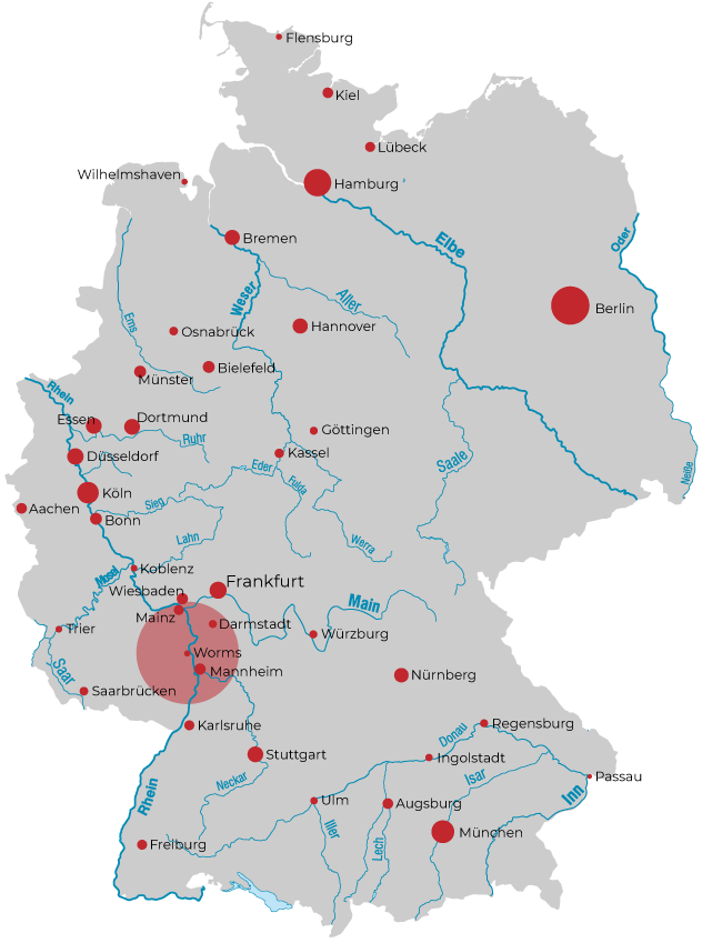 In der kreisfreien Stadt Worms im Südosten des Bundeslandes Rheinland-Pfalz leben derzeit ungefähr 87.000 Einwohner in neunzehn Stadtteilen.